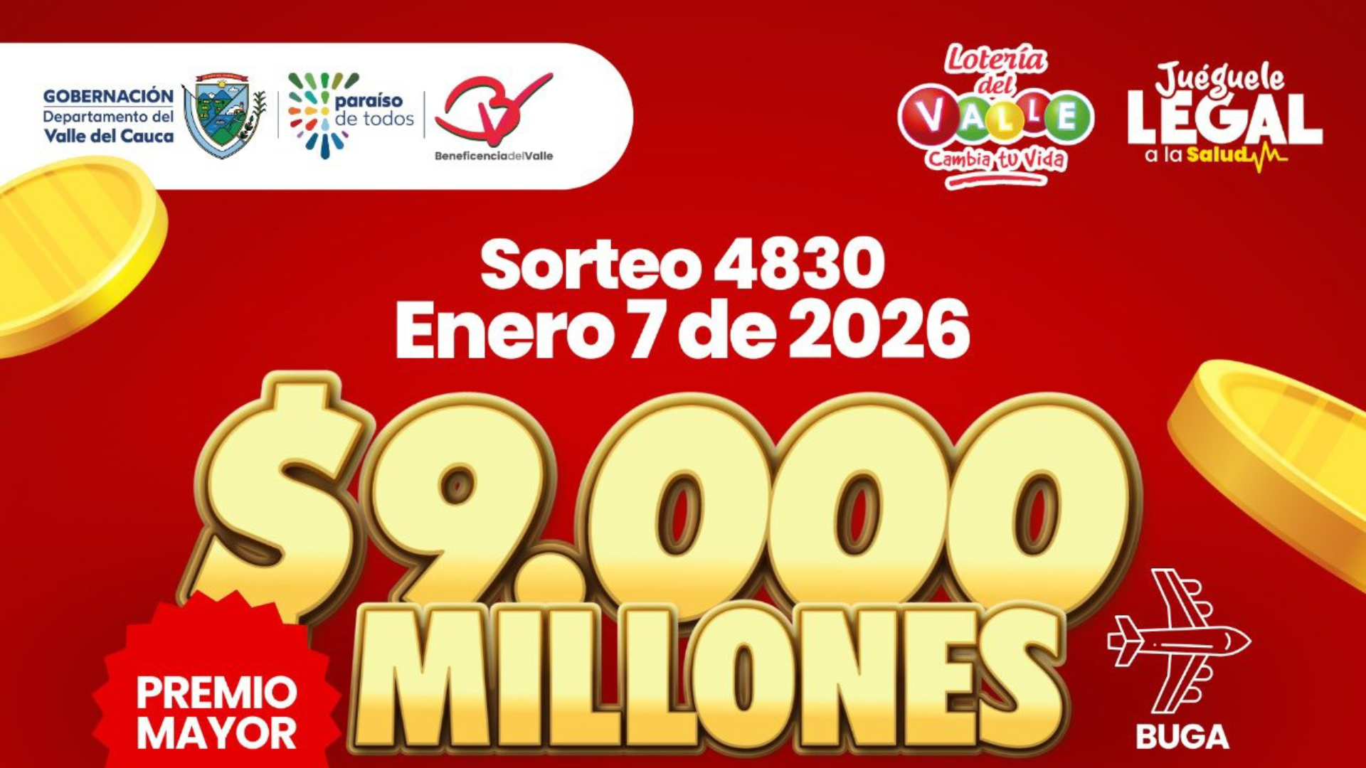 La Lotería del Valle realizó este miércoles 7 de enero de 2026 el sorteo número 4830, cuyo premio mayor de $9.000 millones fue ganado por el número 7284, serie 033, en un evento que se llevó a cabo en el municipio de Buga, Valle del Cauca, y que fue transmitido en directo por el Canal Regional Telepacífico, medio oficial que respalda y acompaña la difusión de este tradicional sorteo.